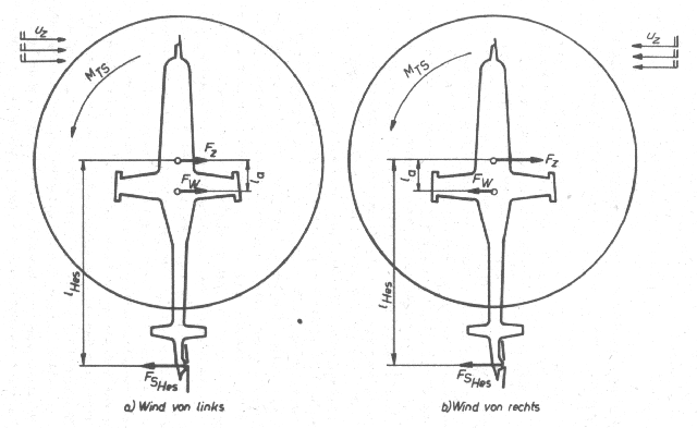 Kräfte und Momente in der Kursrichtung in der Standschwebe bei Seitenwind