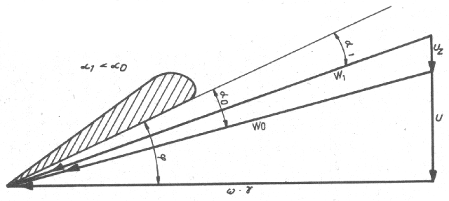 in der Standschwebe bei Seitenwind von links erklärt. Bekanntlich befindet sich in der Standschwebe bei Seitenwind der Angriffspunkt der dabei entstehenden Seitenkraft des Widerstands FW hinter dem Schwerpunkt des Hubschraubers. Dadurch entsteht das Moment des Rumpfwiderstands FW * l. Bei Seitenwind von links (Bild 1/8a) wird das Moment des Rumpfwiderstands mit dem Reaktionsmoment der Tragschraube addiert. Dadurch verringert sich der erforderliche Wert des Heckschraubenschubs in diesem Falle im Vergleich zur Standschwebe bei Gegenwind. Andererseits ist auch bekannt, daß die Heckschraube in der Standschwebe bei Gegenwind im Regime der schrägen Umströmung und bei Seitenwind im Regime der axialen Umströmung arbeitet. Die Axialströmung entsteht in diesem Falle durch die Windgeschwindigkeit. Aus dem auf Bild 1/9 dargestellten Geschwindigkeitsdreieck ist ersichtlich, daß bei Seitenwind von links die Anstellwinkel der Blattelemente der Heckschraube kleiner werden. Dadurch verringert sich auch der verfügbare Schub der Heckschraube. Somit vergrößert sich in der Standschwebe bei Seitenwind von links der erforderliche Schub der Heckschraube, und der verfügbare Schub verringert sich (bei konstanter Heckschraubensteigung). Zum Einhalten der Richtung in der Standschwebe ist in diesem Falle ein zusätzlicher Ausschlag des rechten Pedals erforderlich.