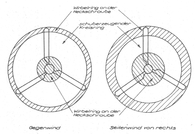 Bereich der Blattwurzel und des Bereichs der Wirbelbildung der Blattspitzen (Bild 1/11) die wirksame Fläche des Arbeitsbereichs der Heckschraube, in dem die Vergrößerung des Schubs erfolgt, verkleinert. Im Ergebnis verringert sich der verfügbare Schub der Heckschraube bei Seitenwind von rechts. Der Heckschraubenschub verringert sich soweit, daß bei dem früheren (für Gegenwind fixierten) Wert der Heckschraubensteigung die Summe des Heckschraubenmoments und des Moments des Rumpf-
