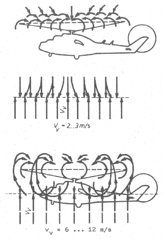 Beim weiteren Sinkflug des Hubschraubers wird dieses Luftvolumen, das sich über der Drehebene der Tragschraube befand, erneut in den Strom gesaugt und strömt dabei an der Fläche des Drehkreises der Tragschraube vorbei. Somit zirkuliert eine bestimmte Luftmenge um die Blattspitzen, wobei der Wirbelring gebildet wird. Die Fläche der Tragschraubenblätter, die sich im Wirbelring befindet, erzeugt keinen Schub. Praktisch beginnt die Bildung des Wirbeleffektes bei vertikalen Sinkgeschwindigkeiten von 1 ... 3 m/s. In diesem Falle erfolgt jedoch das Zusammentreffen der beiden Ströme in größerer Entfernung vom Hubschrauber, und die Wirbel üben keinen wesentlichen Einfluß auf den Schub der Tragschraube aus. Mit der Vergrößerung der vertikalen Sinkgeschwindigkeit über 3 m/s nähert sich der Treffpunkt der Luftströme der Drehebene der Tragschraube. Der Wirbelring wächst an und die Fläche des Bereichs, der sich im Wirbelring befindet, wird größer; dadurch verringert sich der Tragschraubenschub, und die vertikale Sinkgeschwindigkeit vergrößert sich. Der Hubschrauber beginnt zu schütteln, und seine Steuerbarkeit verschlechtert sich.