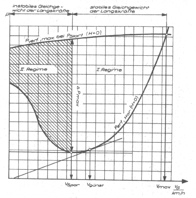 Bild 1/20 Abhängigkeit der erforderlichen und verfügbaren Leistung von der Geschwindigkeit des Horizontalfluges